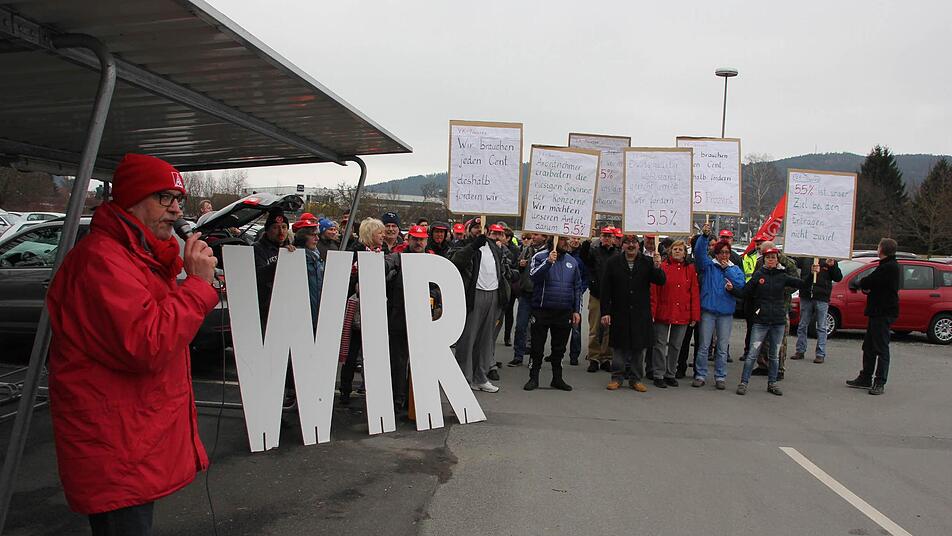 Weitere Proteste Am Freitag laufen weitere Warnstreiks bei der Firma Fischer in Burgkunstadt und bei Lear in Kronach. Die Lear-Mitarbeiter sollen eine Stunde früher Schluss machen. "Wir bereiten uns bereits auf die zweite Warnstreikphase nach dem Fasching vor", kündigte Jürgen Apfel an. Am 23. Februar gebe es eine Kundgebung in Coburg. Wenn es dann keine Bewegung gebe, werde man die Urabstimmung vorbereiten.
