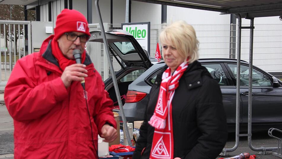 Pfiffe, Reden und Musik: Für eine Dreiviertelstunde legten Valeo-Mitarbeiter am Mittwoch die Arbeit nieder. Sie folgten damit dem Aufruf der Gewerkschaft IG Metall, deren Tarifforderungen in den laufenden Verhandlungen mit den Arbeitgebern zu unterstützen. Mehrere Dutzend Mitarbeiter der insgesamt 174 Beschäftigten, die im Drei-Schicht-Betrieb arbeiten, nahmen am Warnstreik teil.