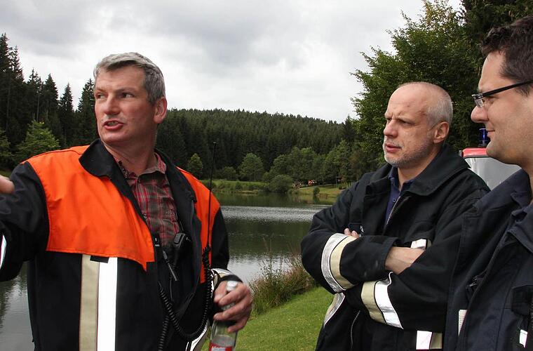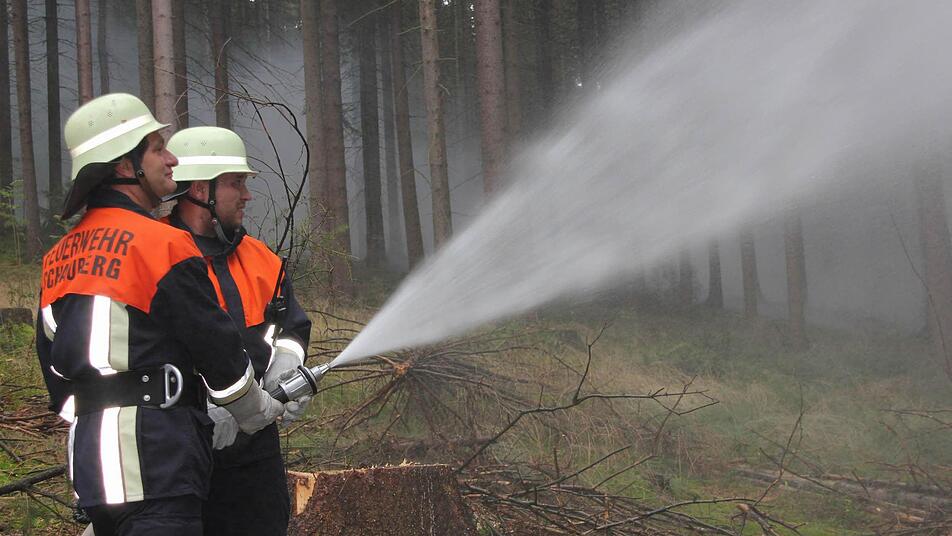 14.08 Uhr: Norbert Butters und Johannes Kappe halten den Wasserschlauch gezielt auf die Rauchwolken. Doch plötzlich kommt kein Wasser mehr. "Was ist da mit der Wasserversorgung los? Wir brauchen Wasser", schreit Abschnittsleiter Mathias Vetter von der Feuerwehr Steinbach am Wald in sein Funkgerät. Eine Pumpe ist kaputt, die Schauberger sollen ihre Pumpe zum Austauschen bringen, heißt es kurz darauf. Derweil sitzen einige Feuerwehrleute im Wald herum, warten - bis es um 14.20 Uhr wieder heißt "Wasser Marsch". Im Ernstfall böte sich dort einem wohl eher ein anderes Bild. "Das darf nicht passieren", sagt Christian Schulz, Steinbacher Kommandant und Leiter dieser Großübung, die wegen der zwei Brände in zwei Einsatzstellen aufgeteilt ist. Einsatzleiter sind Christian Wick, Kommandant der Tettauer Feuerwehr, im Bereich des Ölschnitzsees und Matthias Werth, Zweiter Kommandant in Steinbach, im Bereich der Heeresstraße, wo auch die Schauberger das Feuer bekämpfen.