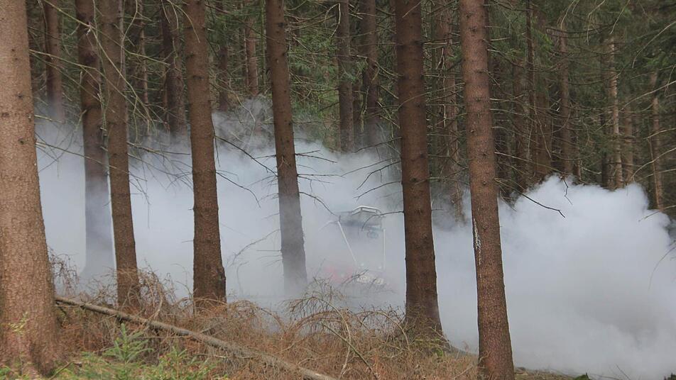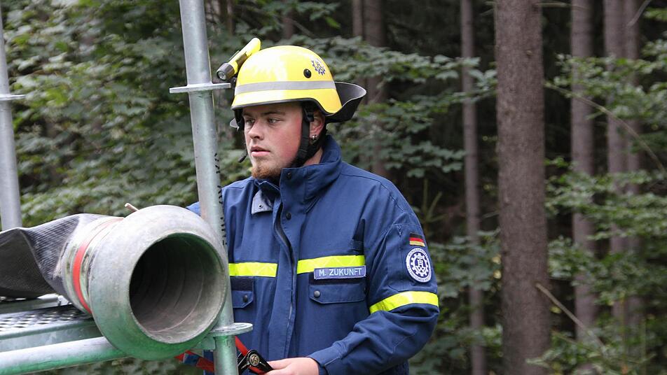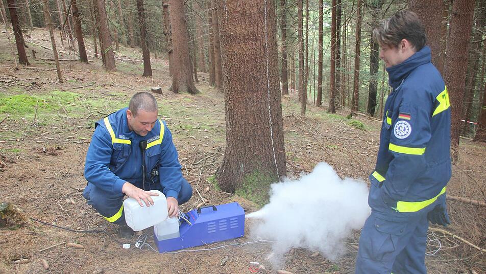 13.50 Uhr: Norbert Butters, Johannes Kappe, Gerhard Langer und Stefan Wolf rennen mit Schlauchkoffern an den Hirschfeldern vorbei in Richtung Wald. "Wir sollen C-Rohre zum Einsatzort bringen", erklärt Kommandant Detlef Kappe. Durch einen Bach und über eine Brücke aus gesägten Baumstämmen geht es den Hang hinauf in den Wald. Dort dringt sogar Rauch zwischen den Bäumen hervor. Peter Seltmacher und André Völker vom THW Kronach sorgen mit Hilfe einer Nebelmaschine für die Brandsimulation.