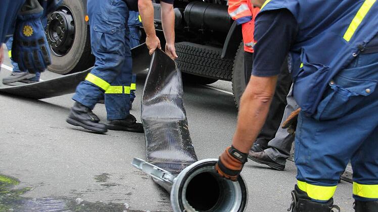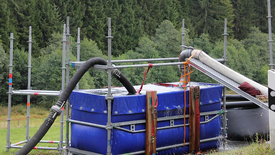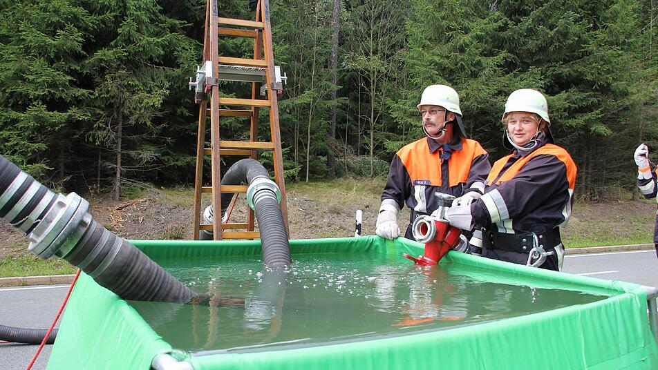 13.40 Uhr: Die Schauberger - eine der kleineren Wehren - sollen sich, am Brandort angekommen, zunächst in Bereitschaft halten. Wenige Meter weiter stehen Silvia Wachter und Urban Förtsch von der Feuerwehr Hirschfeld an einem sogenannten Faltbehälter. Dort wird das Wasser, das ein paar hundert Meter weiter aus dem Ölschnitzsee entnommen wird, über Pumpen hin befördert und mehr Druck aufgebaut.