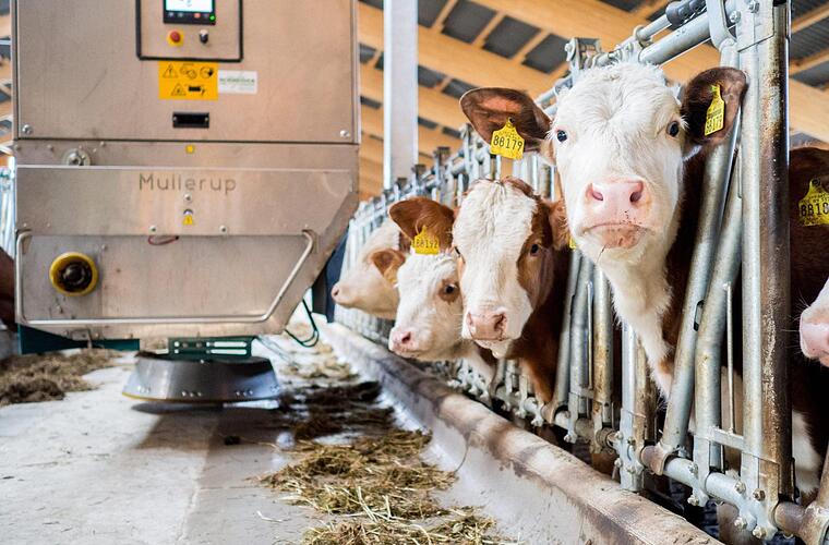 Ein bisschen ist es wie in einem Science-Fiction-Film: Ein großer Container schwebt durch einen Stall. Links und rechts recken Kühe ihre Köpfe durch das Gitter. Doch noch gibt es nichts zu Essen. Zu allererst kehrt der Container die Reste vom Mahl zuvor weg, danach bekommen die Jungkühe ihr Futter - eine Mischung aus Heu, Gras- und Maissilage sowie Getreideschrot und Mineralfutter.