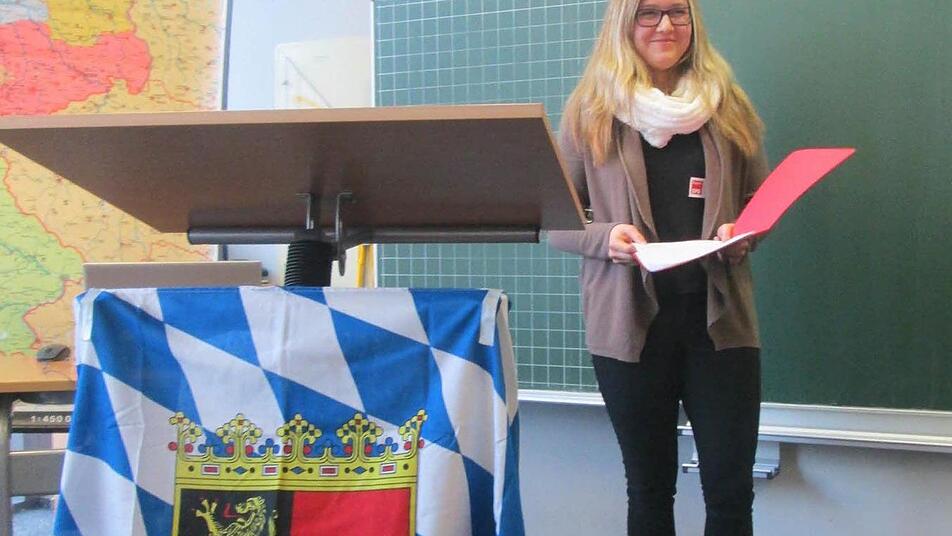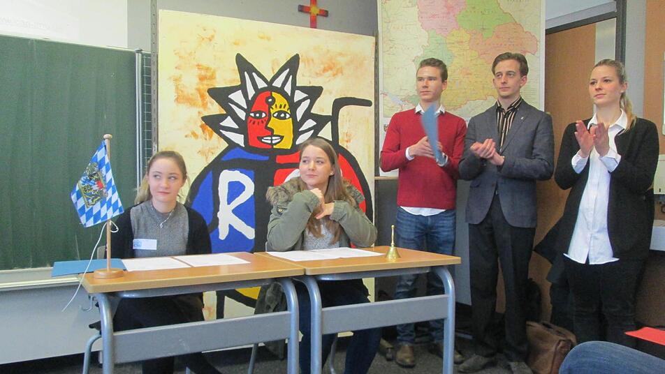 Landtagspräsident Herbert Brunnenbauer (CSU) führt unter den wohlwollenden Blicken seiner "realen Stellvertreterin" durch die zweite Lesung im Plenum und erteilt den jeweiligen Rednern das Wort. Malina Stein (Jana Göpfrich, 10A) für die CSU, Günther Stammbaum (Fritz Kropf, 10A) für Bündnis 90/Die Grünen, Kathrin Lieb (Stella Beez, 10C) für die Freien Wähler und Georg Schmitt (Marius Mühlherr, 10C) für die SPD beleuchten noch einmal den Standpunkt ihrer Parteien. In der anschließenden Abstimmung geht der überarbeitete Gesetzesentwurf durch den Landtag.