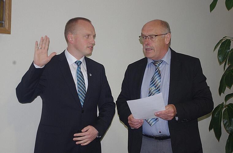 "Bewährtes erhalten, Zukunft gestalten" - Das möchte Steinbachs neuer Bürgermeister Thomas Löffler, wie er bei der von ihm erstmals geleiteten Gemeinderat-Sitzung betonte. Es war ein feierlicher Moment, als ihm der älteste Gemeinderat, Dritter Bürgermeister Klaus Neubauer (SPD), den Eid auf das Grundgesetz abnahm. Der 37-jährige Löffler, bisher Gemeinde- und Kreisrat, war bei der Bürgermeister-Wahl im März mit 60,54 Prozent der Stimmen gewählt worden.