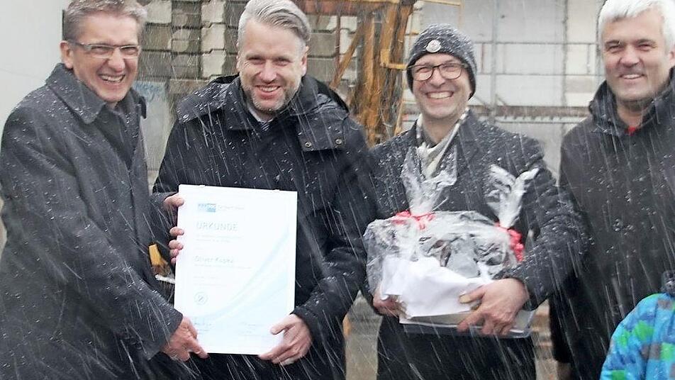 Der Vorsitzende des IHK Gremiums, Hans Rebhan, überreichte den beiden Geschäftsführern Clemens Scholz und Oliver Kupka eine Urkunde für "besondere unternehmerische Leistungen". "Ihr gehört zu den ,Hidden-Champions‘ Oberfrankens!" Seit 27 Jahren sei die Wom nun in Ludwigsstadt und aus den anfangs 15 Mitarbeitern seien mittlerweile knapp 300 geworden, äußerte er seine Anerkennung. Seit 2008 hätten 54 junge Menschen ihre Ausbildung bei der IHK mit Erfolg beendet. "Danke, dass Sie an die Region glauben!". Jan Deckelmann von der Firma Deuerling Holzbau sprach den Richtspruch. Und er brachte es auf den Punkt, als er sagte: "Ein Weltmarktführer baut neu und die Region kann sich freuen!"