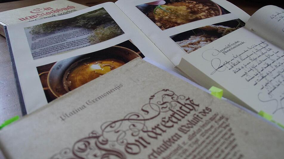 Zum Spektrum von Flores Artium gehört auch das Kochen nach historischen Rezepten. Tina Vadász-Hain hat im Nu einen Schwung Kochbücher auf dem Tisch, in denen Gerichte in alter Schrift aufgelistet sind. Auf den gesellschaftlichen Stand der Gäste, das Temperament und auf die Elemente wurde bei den Speisen und der Zubereitung geachtet. "Schweinefleisch war heiß und trocken, deshalb machte man zum Ausgleich Sauerkraut dazu.