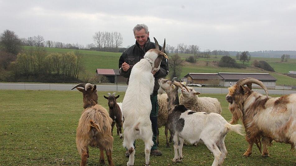 Mit einem gewissen Stolz zeigt Oswald Marr seinen kleinen Bauernhof. Schafe, Hühner, Tauben, Hasen, Ziegen und Katzen sind auf dem weitläufigen Areal zu sehen. Und da gibt es noch Picasso, seine Lieblingsziege, die Oswald Marr auf Schritt und Tritt begleitet. Den Namen Picasso hat er bewusst gewählt, da das Gesicht der Ziege so kunstvoll gezeichnet ist.