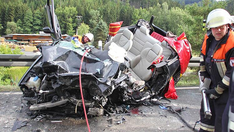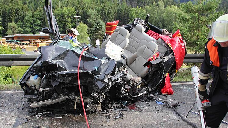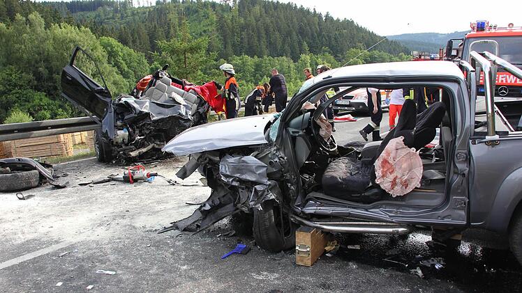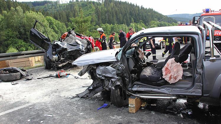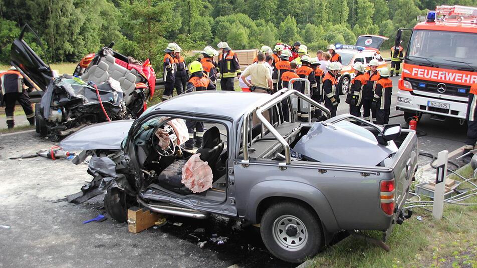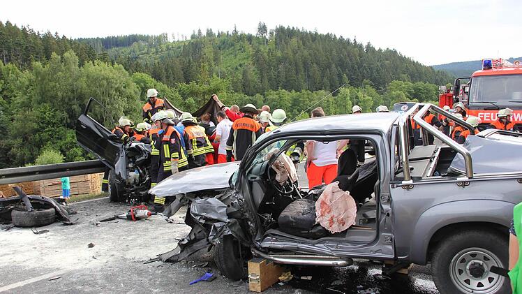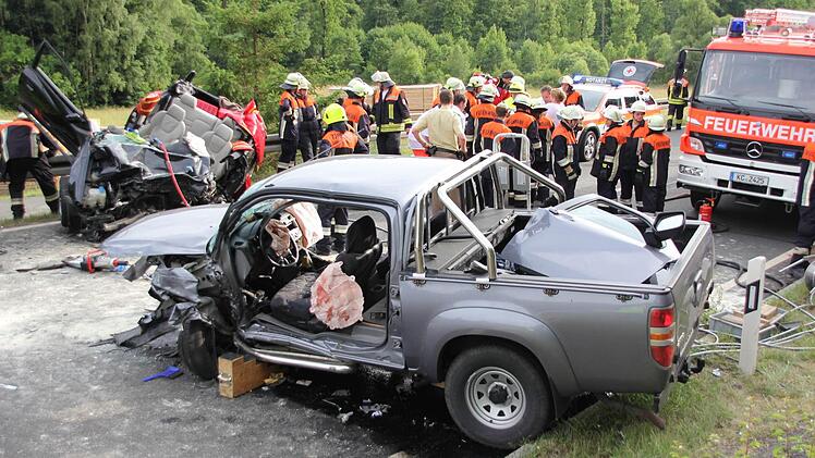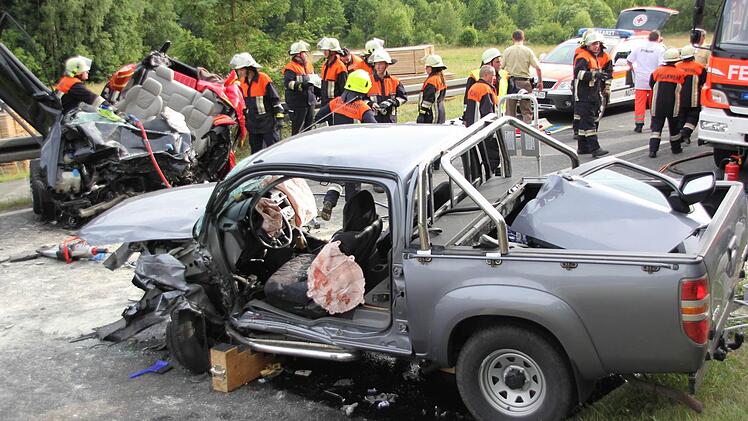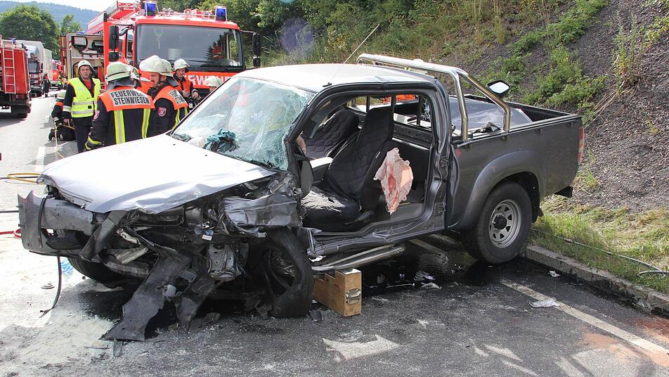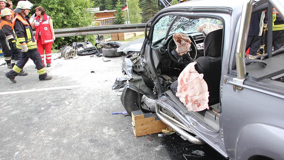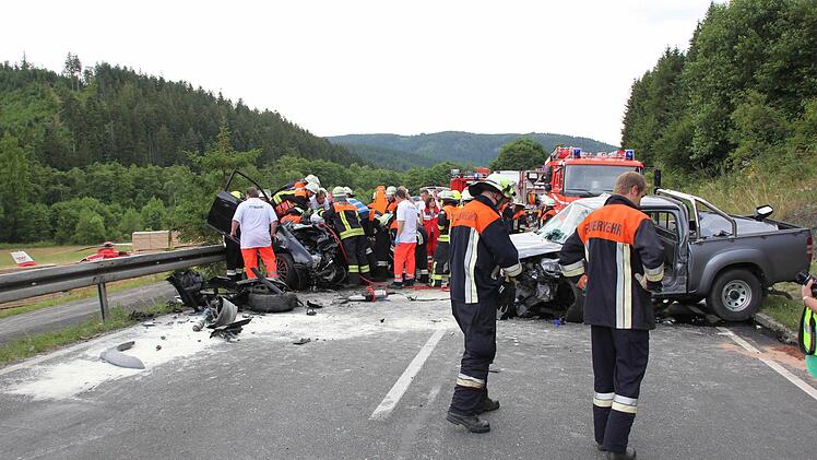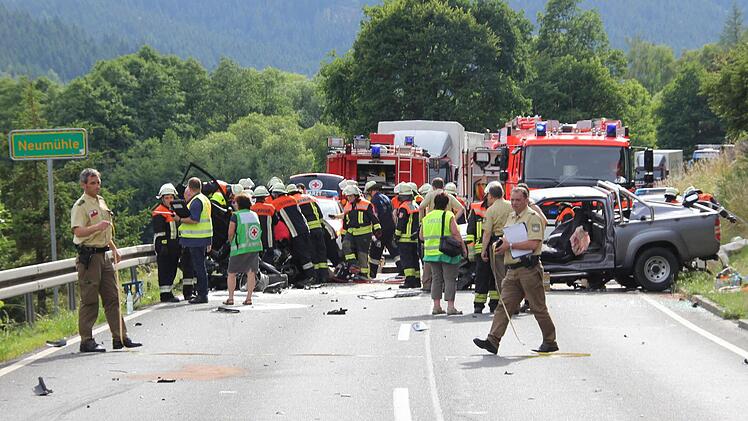 Nach einem schweren Unfall am Freitag kurz nach 16.30 Uhr wurden zwei Schwerstverletzte mit Rettungshubschraubern in Spezialkliniken geflogen. Ein Pickup und ein Audi wurden total beschädigt, ein Sprinter erheblich. Die Bundesstraße war stundenlang blockiert.