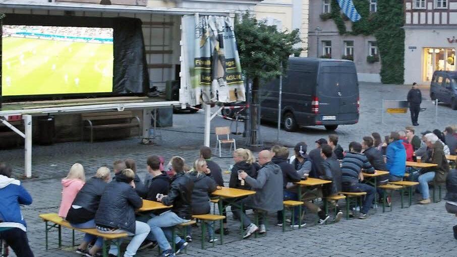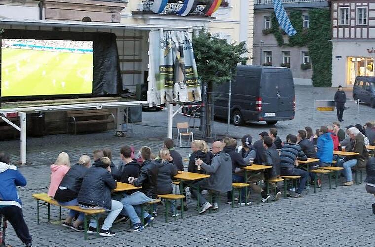 Zusammen mit Helmut Völkl vom Tourist- und Veranstaltungsservice der Stadt, Pressesprecher Simon Ries und Stadtrat Wolfram Brehm verfolgt Schramm das Geschehen auf der LED-Leinwand, die Christian Potthast (SoundArt) bereitgestellt hat. "Ich habe 2:1 getippt", so der OB, der zuversichtlich ist, dass die deutsche Mannschaft an diesem Abend mit einem Sieg ins Turnier startet. Das hofft auch Comedian Stefan Eichner ("Das Eich"), der in Gesellschaft von Christian Potthast und Heli Reißenweber ("Stahlzeit") vor dem Brunnen steht und fachsimpelt.