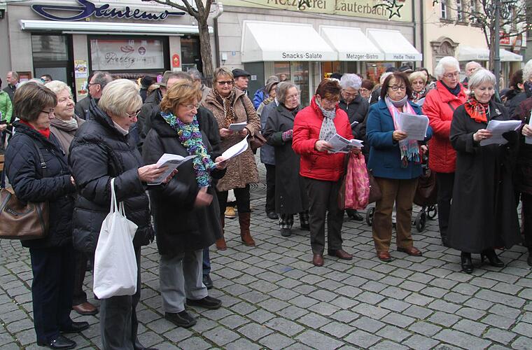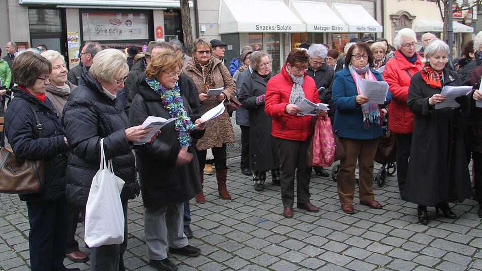 Die Vorweihnachtszeit ist auch eine Zeit, Gutes zu tun. Deshalb organisierten der Verein "Fair-ein", der sich für eine gerechtere Welt einsetzt, gemeinsam mit "Unser Kulmbach" und dem Imbiss Battistella sowie der Singgemeinschaft Kulmbach zur Mittagszeit ein gemeinsames Adventssingen. Für jeden Sänger, der mitsang, spendet das evangelisch-lutherische Dekanat zwei Euro, erklärte Kerstin Weber das Prozedere.