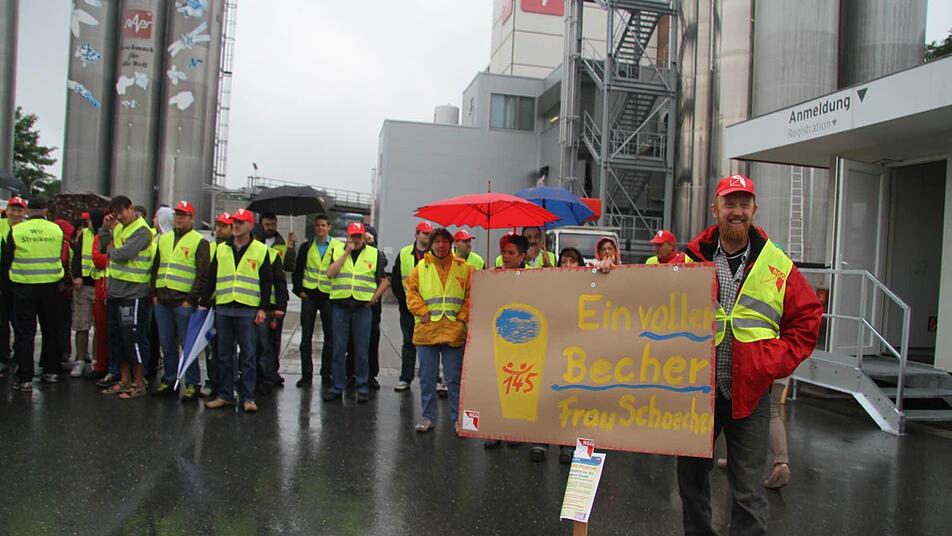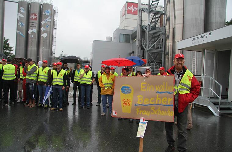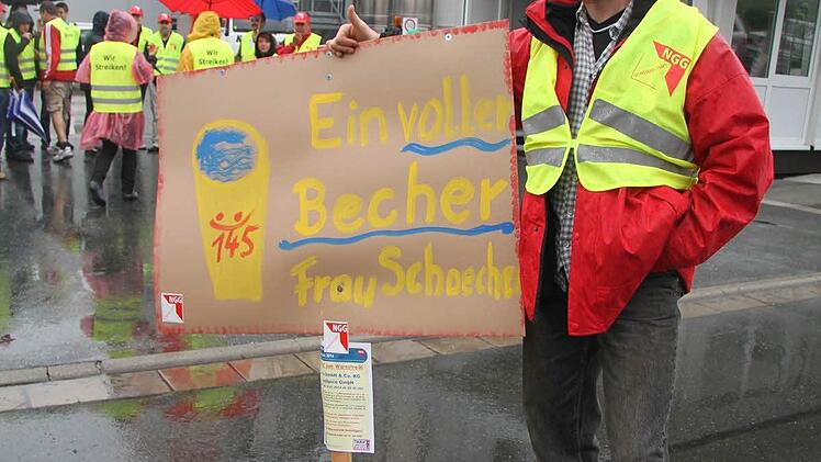 "Es geht uns um 145 Euro mehr Geld. Das ist wichtig, damit wieder was übrig bleibt", formuliert Betriebsrat Peter Geißler die konkreten Forderungen der Gewerkschaft und der Raps-Mitarbeiter. "Das ist nicht zu viel, wir wollen nur wieder weiterkommen. Und das sehen alle Leute so, die hier beim Warnstreik sind", sagte Geißler und hielt ein selbstgemaltes Schild mit der Aufschrift "Ein voller Becher, Frau Schaecher" hoch. Die Streikbereiten möchten sich direkt an die Geschäftsführerin des Gewürzunternehmens Raps wenden.