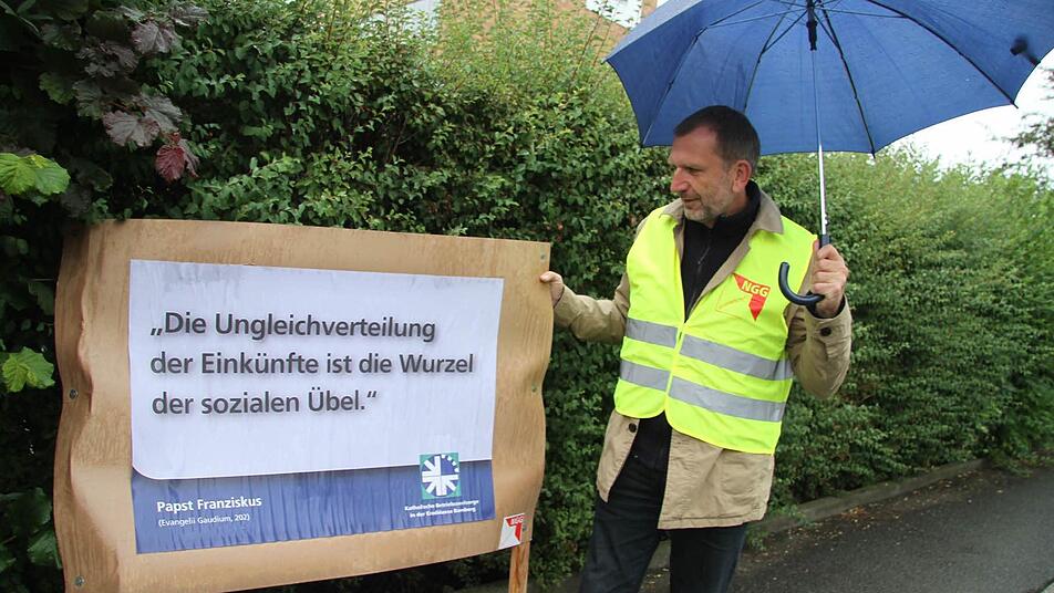 "Das, was hier passiert, ist wunderbar. Die Menschen zeigen sich solidarisch", kommentierte Eckhard "Joey" Schneider die Aktion. Besonders freute sich der Betriebsseelsorger, dass die Menschen mit Papst-Zitaten jetzt für Chancengleichheit sorgen. "Die Ungleichverteilung der Einkünfte ist die Wurzel allen Übels", zitierte Schneider Papst Franziskus und hielt natürlich besonders gerne die Plakate mit den Papst-Zitaten hoch.