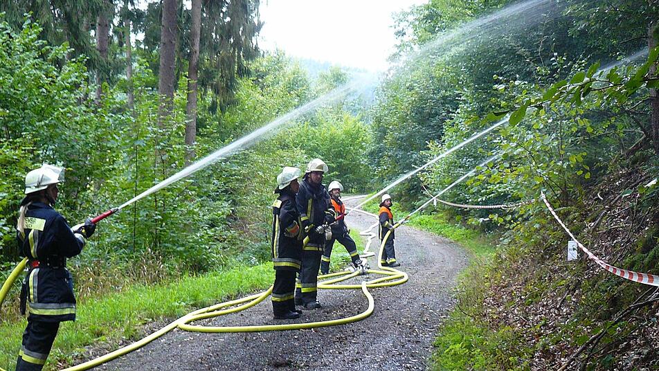 Mehr als 200 Aktive aus 29 Feuerwehren waren am Samstag bei einer großangelegte Übung im Steinachtal gefordert. Mit 35 Fahrzeugen rückten die Einsatzkräfte an, um einen Waldbrand in unwegsamem Gelände zu bekämpfen.