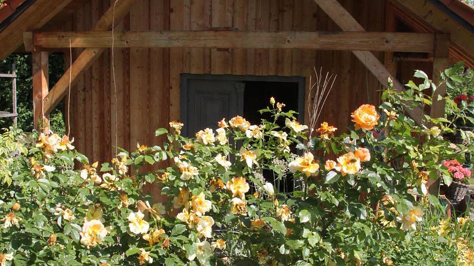 Zu sehen gibt es eine ganze Menge: einen Bauerngarten mit alten Obstbäumen, Rosen, Terrassen und Buchshecken, einen Gemüsegarten und ein schmuckes Gartenhaus. Und überall sind liebevolle Details zu entdecken: der Ofen, der zum Briefkasten umfunktioniert wurde, den Wetterhahn und das eingewachsene Baumhaus.