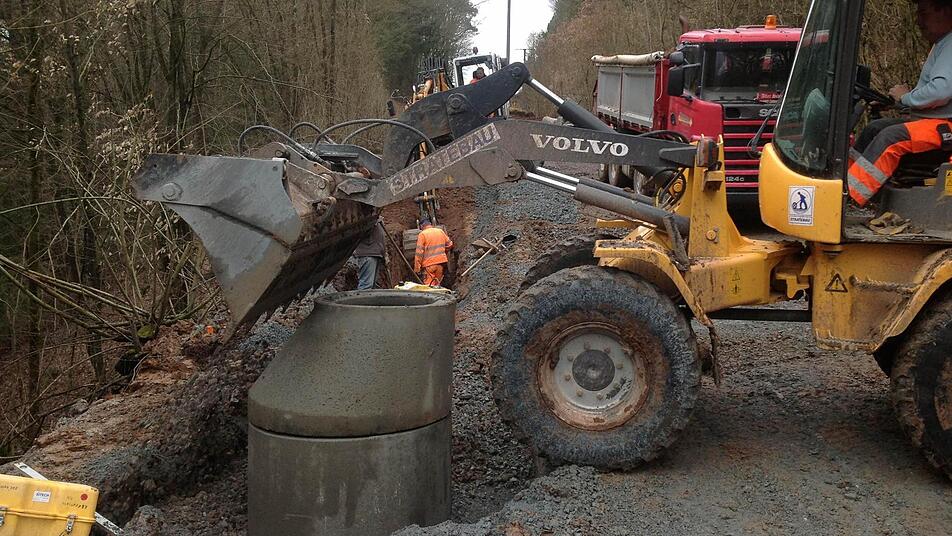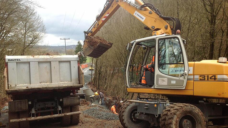 80 Tonnen Zement stabilisieren den Hang, 180 Meter Betonrohr sind derzeit schon verlegt. Das Straßenniveau wird noch um fast einen Meter angehoben, bis die Baustelle vor Witzmannsberg beendet ist.