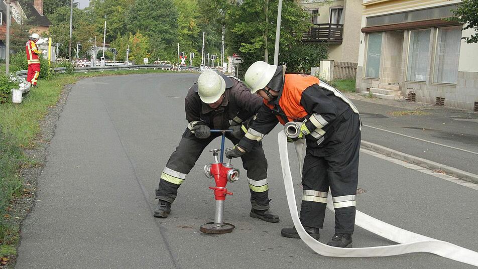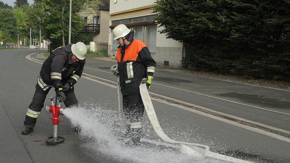 Innerhalb weniger Minuten waren die ersten Feuerwehrleute bereits so weit, dass sie die Wasserversorgung aufbauen konnten. "Wir wollten zwei Förderstrecken aufbauen", erklärte stellvertretender Kommandant und Einsatzleiter Michael Ködel. Die ersten Männer koppelten die Schläuche schon an. Doch da schlich sich eine Panne ein - es spritzte nach allen Seiten. "Das macht aber nichts, das passiert", kommentierte Ködel das kleine Malheur.