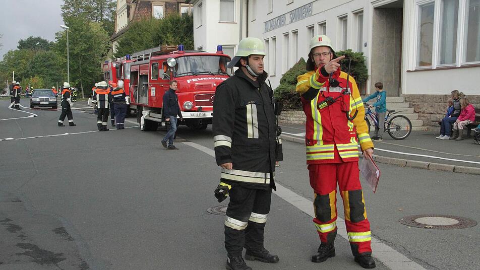 Es war punkt 9 Uhr: Der Feueralarm sorgte für Aufmerksamkeit. Aus dem ganzen Ort liefen Schaulustige zusammen, Bürgermeister Dieter Adam wartete schon vor der alten Spinnerei. Denn längst war durchgesickert, dass auch in diesem Jahr zum Auftakt des Hallenfestes der Feuerwehr Mainleus eine große Schauübung stattfinden soll.