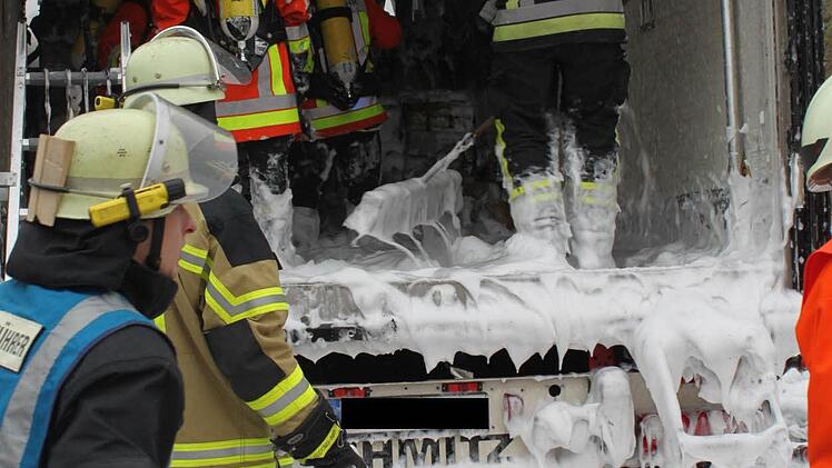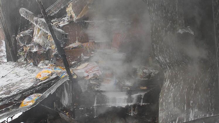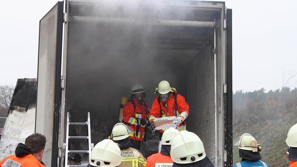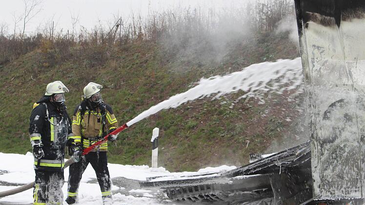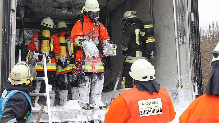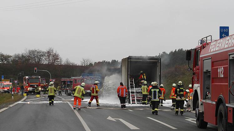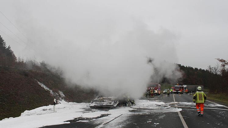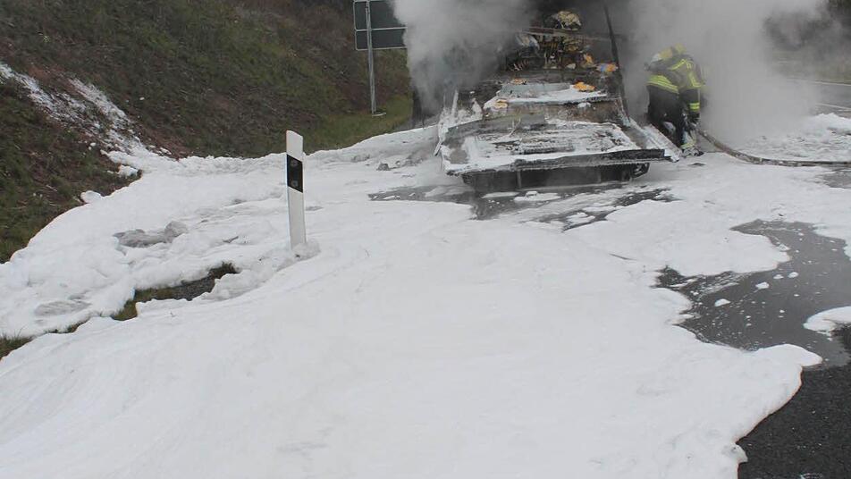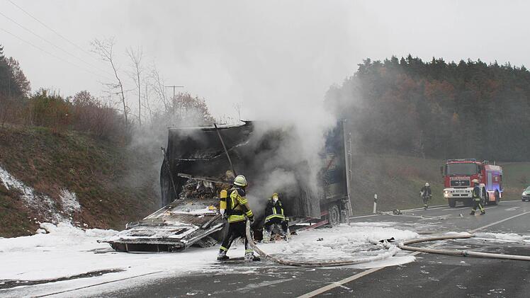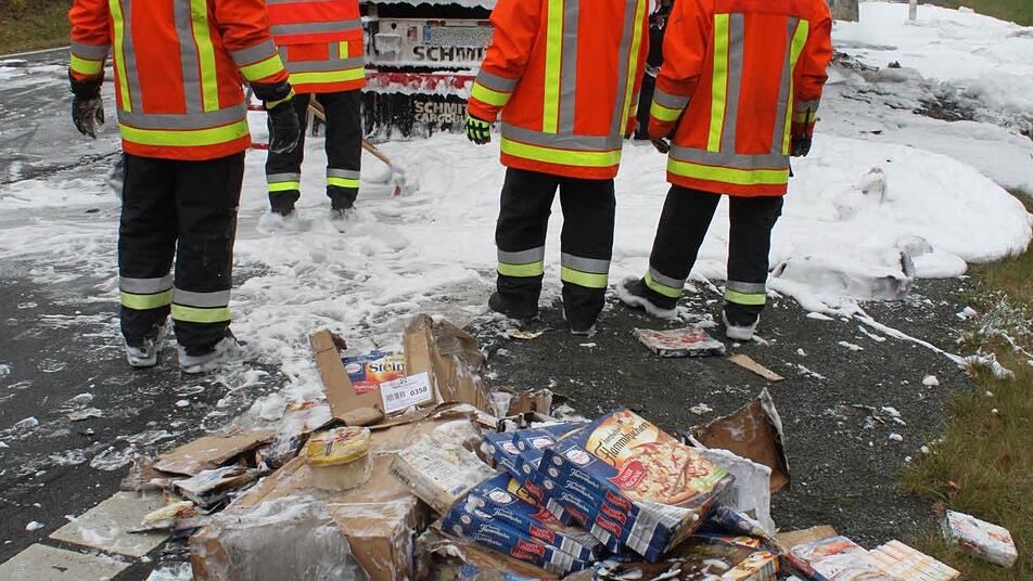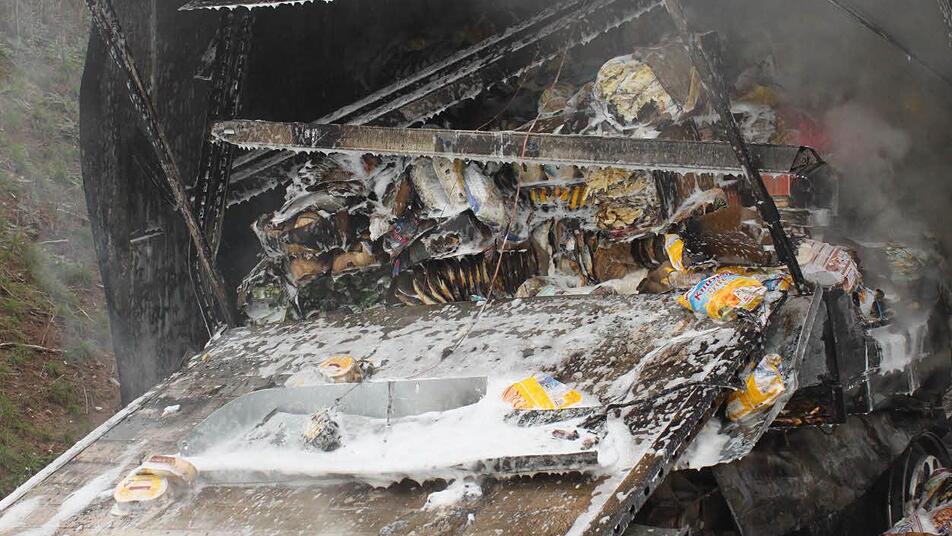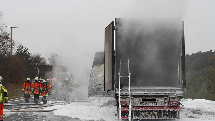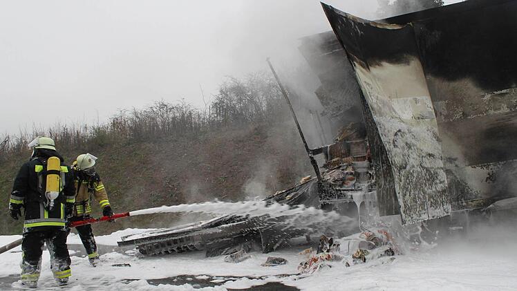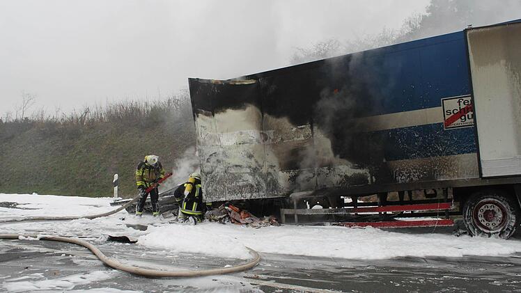 Ein Anhänger, der gefrorene Lebensmittel geladen hatte, brannte am Freitag am späten Vormittag auf der Autobahnausfahrt bei Brücklein völlig aus. Von der Ladung blieb nur noch eine aufgeweichte Pampe.
