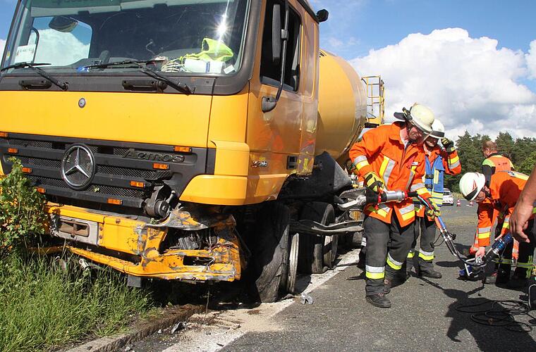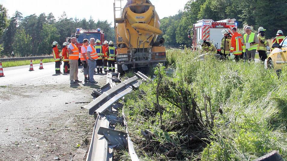Das schwere Fahrzeug kam nach links von der Fahrbahn ab und walzte die Mittelleitplanke auf einer Länge von etwa 50 Metern nieder. Der Betonmischer kam auf dem Grünstreifen zwischen den Spuren zum Stehen.