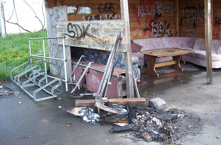 Das ist jetzt gefährlich. Schutt und Unrat lag herum, die Reste des "Osterfeuers". Stühle und der Fahrradständer waren umgeworfen und über dem Platz zerstreut.