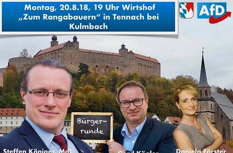 Die AfD-Kreisverbände Kulmbach-Lichtenfels und Hochfranken haben eine Stellungnahme abgegeben, in der es heißt: "Die AfD hatte vor einigen Wochen eine Gaststätte in Tennach bei Kulmbach gebucht. Die gut besuchte Veranstaltung veranlasste den Wirt, auf Nachfrage seitens der Veranstalter, der AfD die Räumlichkeiten ein weiteres Mal zur Verfügung zu stellen. Die nächste Veranstaltung öffentlich zu bewerben und auch dementsprechend die Medien zu informieren, wurde von Seiten des Gastwirtes der AfD während der Veranstaltung angeboten.