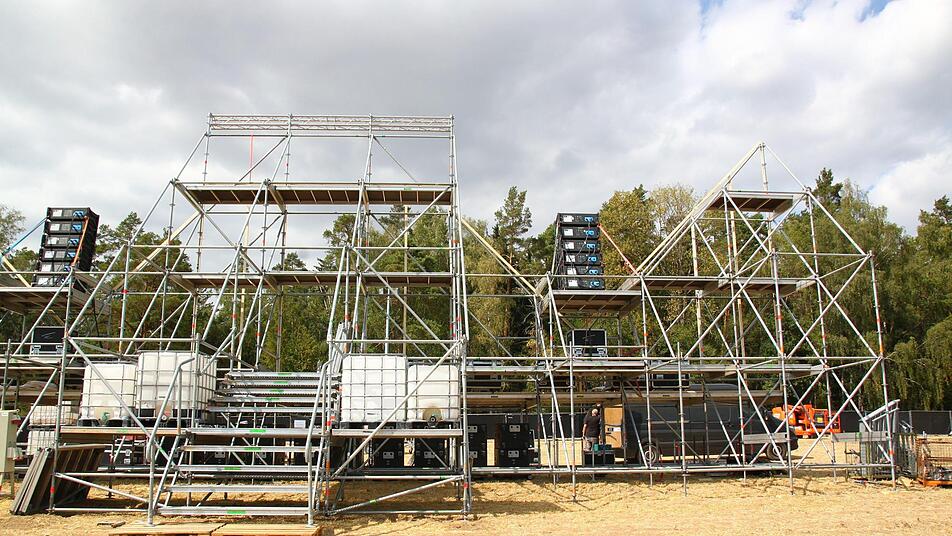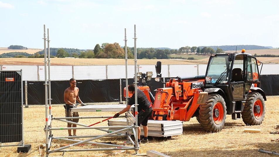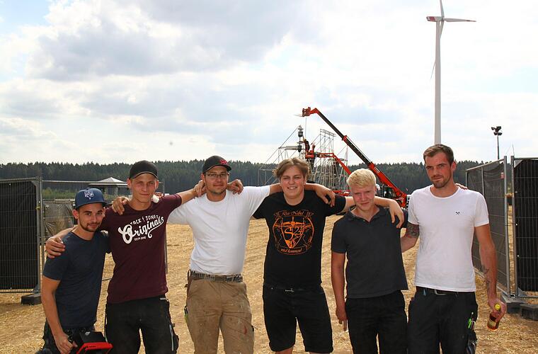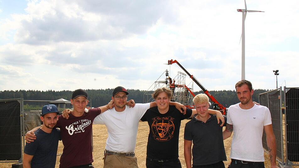 1 Woche dauert der Aufbau des Festivals. Das Team hinter den Kulissen besteht aus Jan Feulner (Video), Jonas Hübsch, Marcel Hermannsdörfer, Felix Popp, Christopher Münch und Jan Seyferth (Foto oben, von links). Dazu gehören außerdem Mitveranstalter Kevin Bauer, Marco Schreck (Logistik), Stefanie Giese (Gastronomie), Lukas Schnapp (Camping) und Katharina Hübner (Backstage).