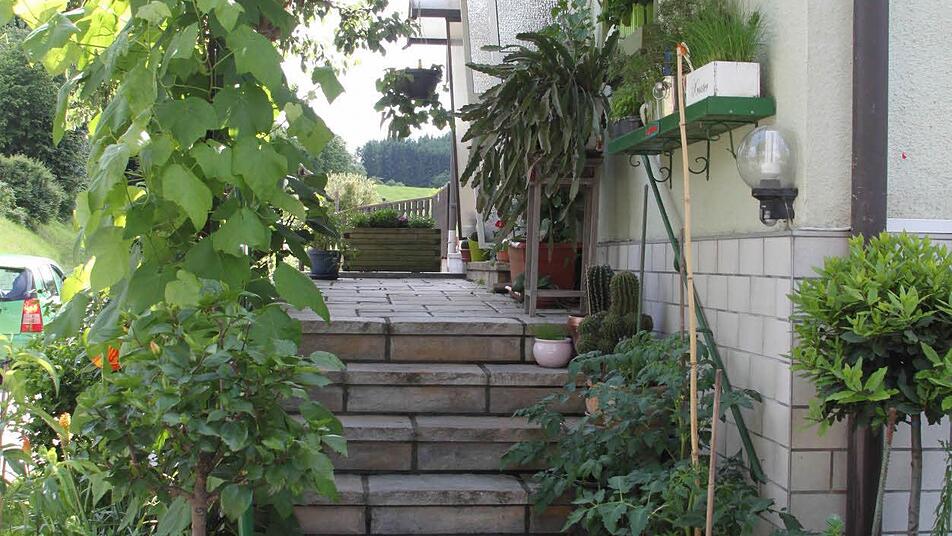 Der kleinste Garten, geschätzt rund zehn Quadratmeter, gehört Bernd und Kathleen Ulbrich. Direkt neben der Langenstadter Kirche gibt es bei ihnen dennoch viel zu sehen - auch Außergewöhnliches: zum Beispiel ein Zitronenbäumchen, eine Ananaspflanze oder den Salat, der in einer Tasche bei den Stufen zum Hauseingang hängt - absolut schneckensicher. "Ein bisschen was machen muss man, damit es schön ausschaut", sagt die Hausherrin.