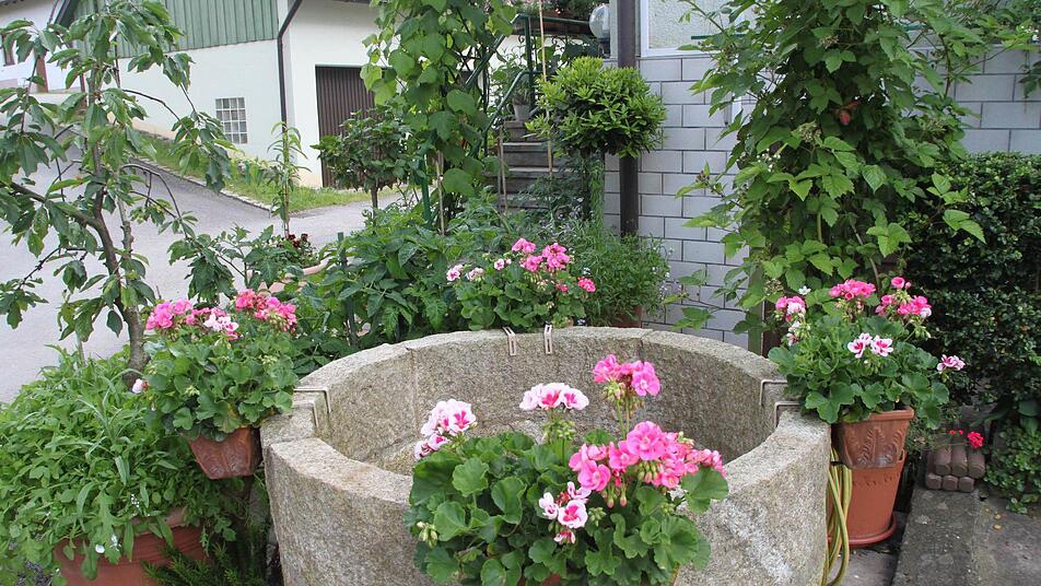 Angela Kaiser, Unterobsang 3 (landwirtschaftliches Anwesen mit vielen Kübelpflanzen und Sommerblumen, Lindenbaum und Nutzgarten)