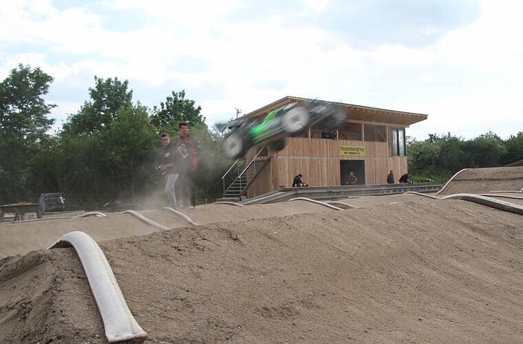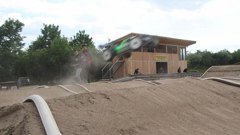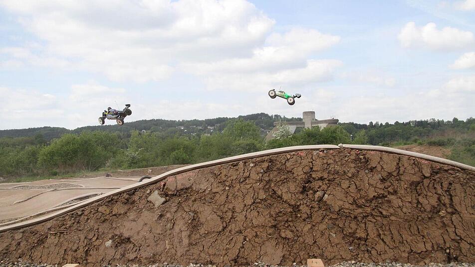 "Es ist Air Time in Kulmbach", sagt Christopher Schellein. Das bedeutet für Nicht-Insider: Dass hinter der Kläranlage die Autos nicht nur superschnell durch das Crossgelände brettern, sondern sogar meterweit fliegen. Und das ist gewollt. Besonders gelungen ist die rasante Fahrt natürlich erst dann, wenn die Autos nach dem Sprung auch wieder auf den Rädern landen und weiterfahren - ohne Hilfe und ohne Eingreifen der Streckenposten.
