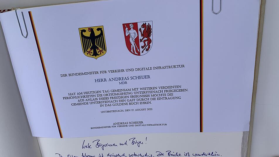 Alfred Vießmann, ehemaliger Untersteinacher Gemeinderat und Kämpfer für die Umgehung, übergab dem Minister einen Brief. "Ein Dankesschreiben - schaut mal. So herzlich wird man selten empfangen", freute sich Scheuer. Endlich seien die Anwohner befreit von Lärm, Schmutz, Feinstaub und Abgasen, so Vießmann. "Die Ortsumfahrung bringt uns nach jahrzehntelangen Bemühungen, eine vollkommen neue Lebensqualität."