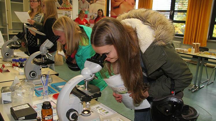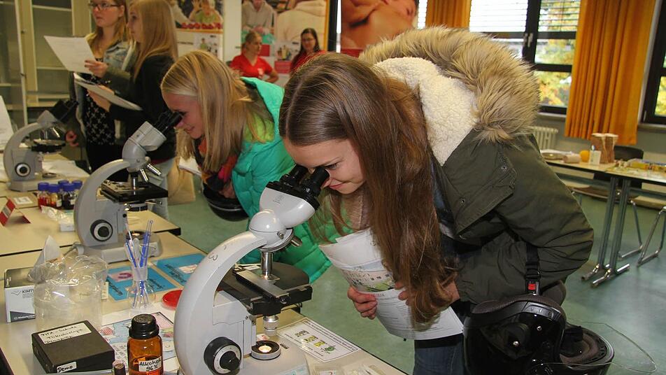 Überhaupt knüpfen bei der Ausbildungsmesse schon lange nicht mehr nur Haupt- und Realschüler, bei denen der Abschluss vor der Tür steht, Kontakte zur Wirtschaft, sondern auch viele Gymnasiasten. Cosima Göldner (15) und ihre Freundin Theresa Vießmann (16) schauen am Stand der MTA-Schule in Bayreuth durchs Mikroskop und sind begeistert. "Wir stellen hier die verschiedenen Themenbereiche vor - Mikrobiologie, Histologie, Hämatologie und chemische Analysen", erklärt Waltraud Deinlein von der Schule.