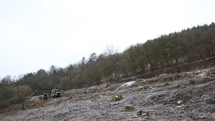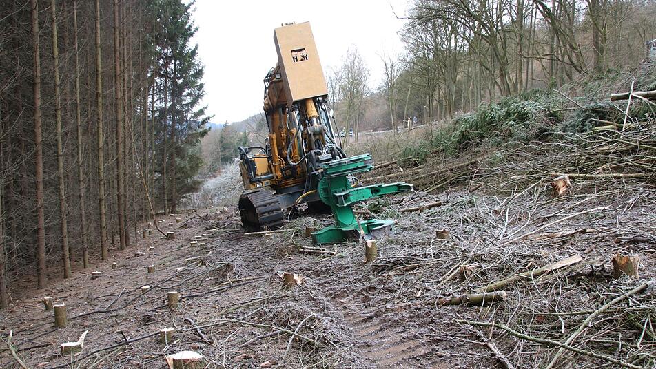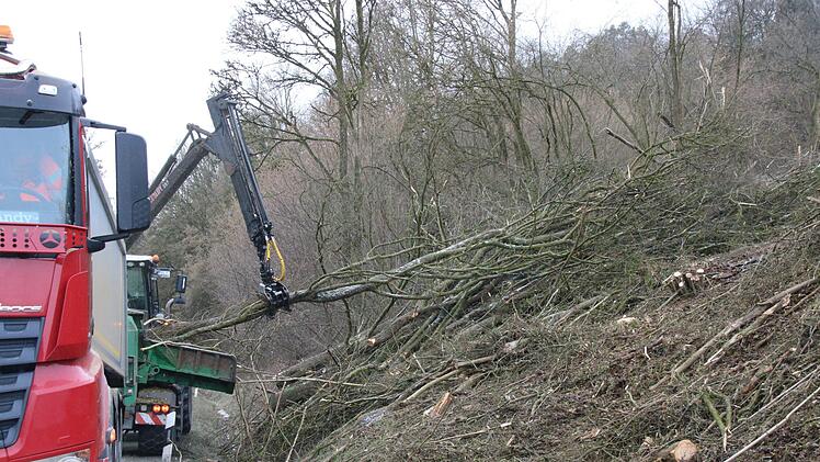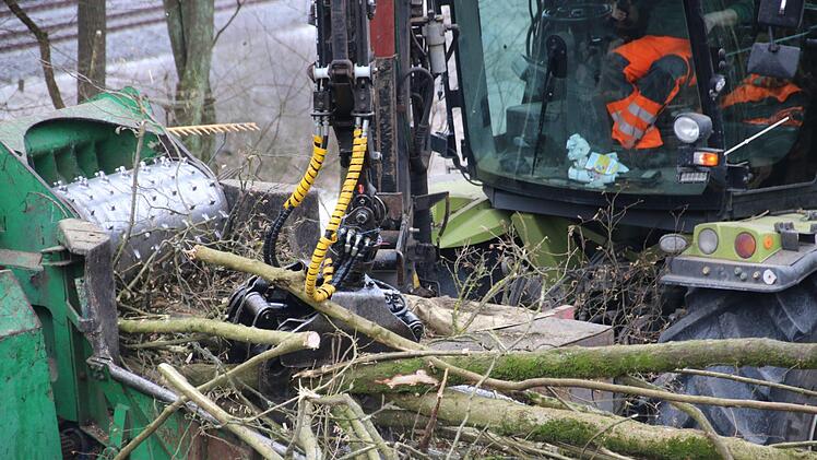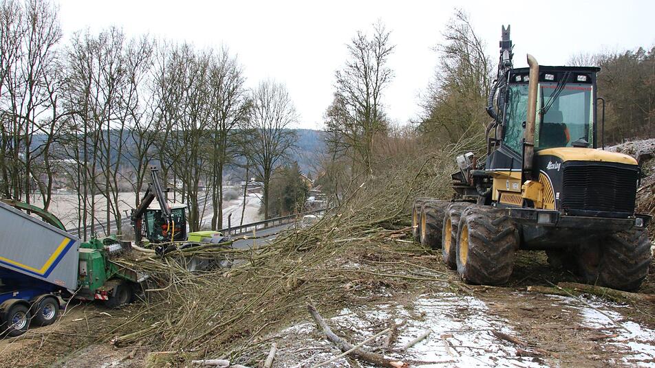 Das Kreischen der  Kettensäge ist weithin zu hören. Späne vom großen Häcksler fliegen durch die kalte Luft. Wie Schneeflocken legen sie sich auf Mantel und Mütze. Mit Polier Andy Well von der Firma Holz Prell aus Gundlitz (Gemeinde Stammbach) begeben wir uns auf einen Rundgang  entlang der B 289. Seit Montag laufen dort großflächig Rodungsarbeiten zwischen Kauerndorf und Untersteinach.