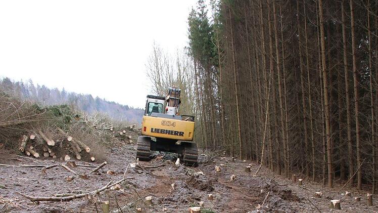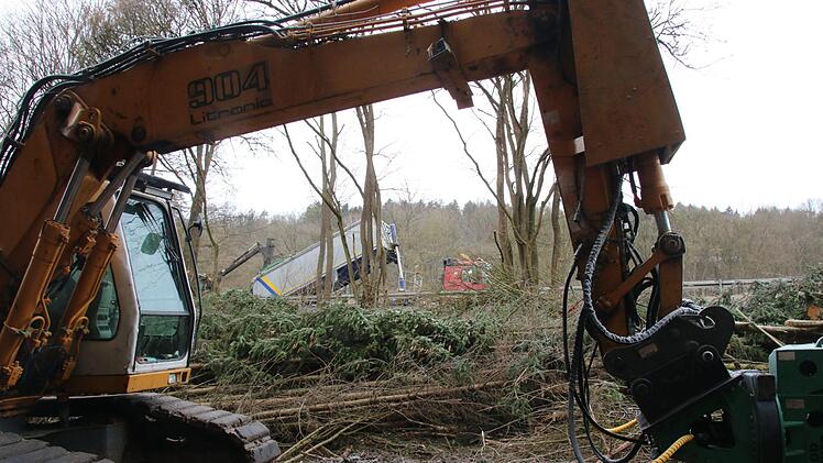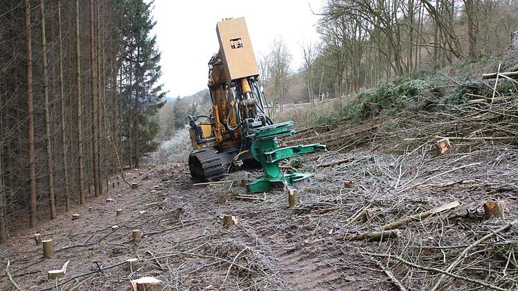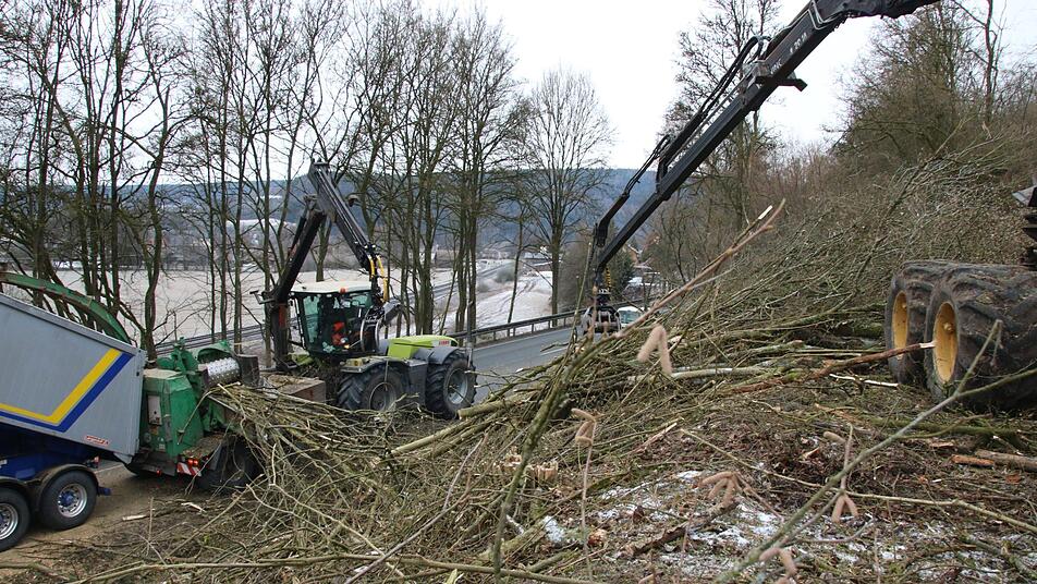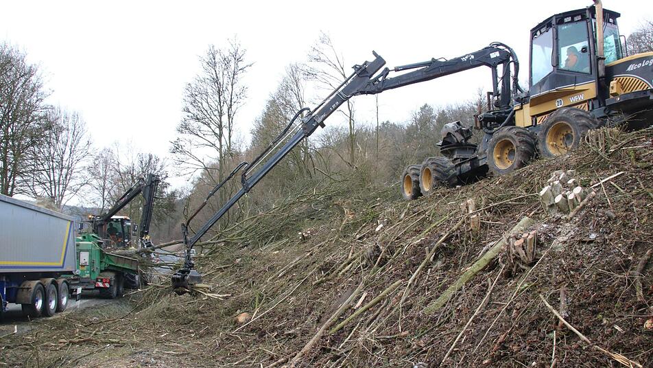 Sieben Mann sind entlang der Bundesstraße im Einsatz. Sie arbeiten mit  Kettensäge, Holzhacker und Rückezug. Allein für die beiden Bagger und den Rückezug fallen täglich 3000 Euro Kosten an. Kein Wunder: Wenn der Häcksler auf vollen Touren läuft, verbraucht er 700 Liter Diesel am Tag.