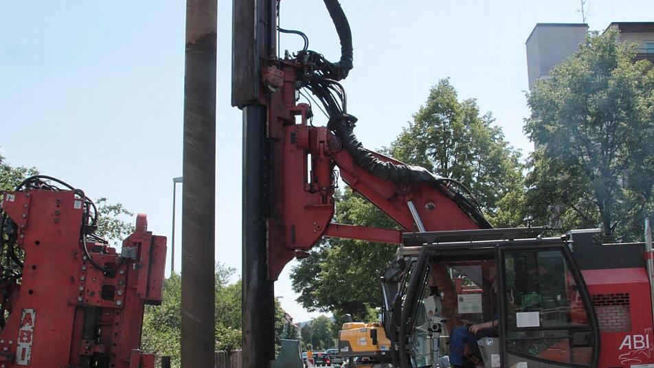 Mit schwerem Gerät werden die Spunddielen acht Meter tief in den Boden im Ängerlein getrieben. Sie dienen zur Absicherung der Baugrube. Die Stadtwerke legen dort - unweit des Hochhauses - einen Schacht an, um die Kanäle an einen Stauraumkanal anzubinden, der Rohre mit einem Durchmesser von 2,20 Metern erhält.