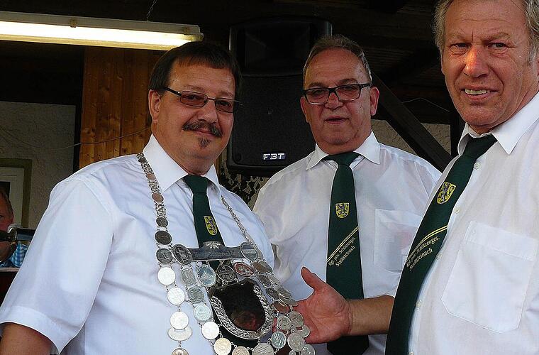 Schützenmeister Raimund Ortlieb legte Jugendkönig Manuel Schnitzler die Kette an, und Reinhard Kraus hatte einen Königsbecher für den Regenten parat. Nachdem Ortlieb auch Uwe Mai mit der Königskette dekoriert hatte, erhielt dieser von Reinhard Kraus den Krug. Mai ließ es sich nicht nehmen, gleich einen kräftigen Schluck zu genießen.