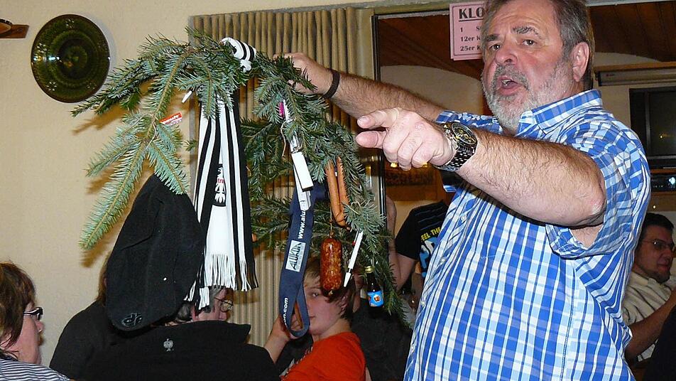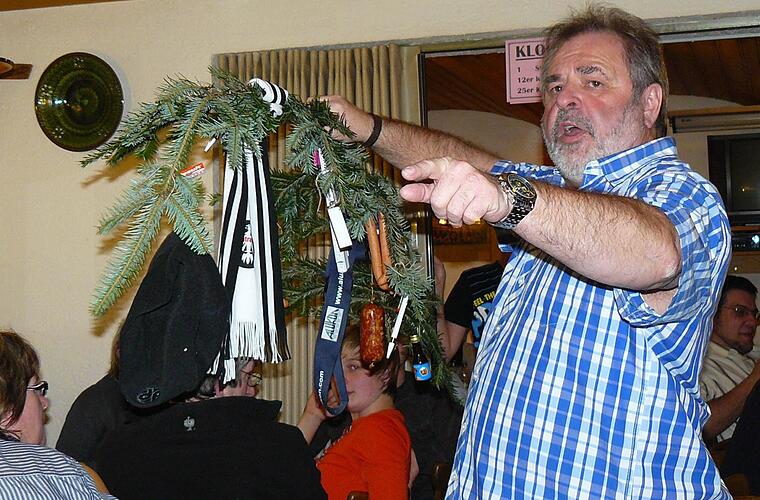 "Österreichischer Stahlhelm" Höhepunkt war die Versteigerung der Gegenstände, die an den voll beladenen Ästen des Christbaums hingen, die Norbert Volk mit blumigen Worten anpries. Würste, ein Schal und eine Mütze ("Österreichischer Stahlhelm") gingen für elf Euro weg. Für einen Zillertaler Fanschal, Wurst, Brotzeit, Kugelschreiber und Werkzeug waren neun Euro zu berappen. Für Hosenträger und Feuerzeug musste man zwölf Euro hinlegen. Beim Hauptpreis, einem Wochenende auf dem Ferienhof "Kosertal" in Marktleugast, trieben die Bieter den Preis in die Höhe. Für 105 Euro kann sich das Gewinnerpaar für drei schöne Tage in der Feriensiedlung entspannen.