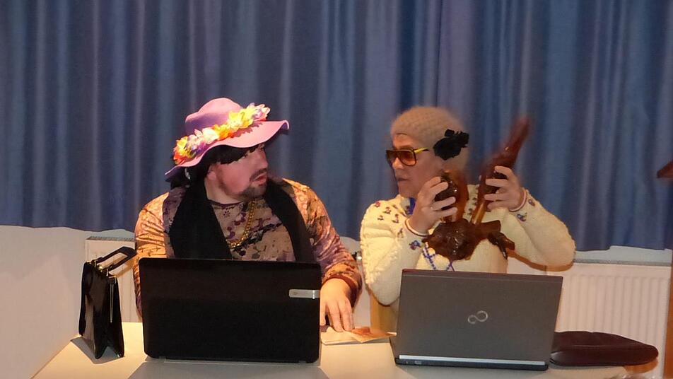 Einfach köstlich Kathi (Alexander Weiß) und Kuni (Klaus Buß) vom Pilgerbüro Marienweiher. Sie berichteten, dass der Workshop zum Basteln von Shisha-Wasserpfeifen der Renner des Jahres gewesen sei. Und beim Seminar "Abnehmen leicht gemacht" habe sich Pater Adrian als Erster eingetragen. Nach dem Motto "Waschbrettbauch statt Waschtrommel" baten Kathi und Kuni den Pater gleich zu Kniebeugen. Der Saal tobte.