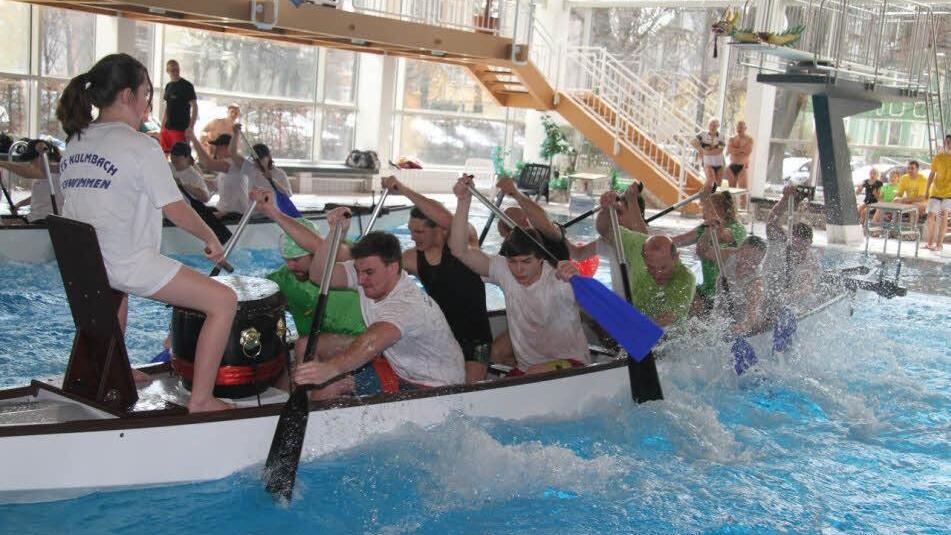 Riesen-Spektakel im Kulmbacher Hallenbad. Denn im Bad findet am Samstag zum ersten Mal ein Indoor-Drachenbootrennen statt. Vier Teams sind dabei - und geben ihr Bestes: Im Kampf dabei sind die Stadtwerke Kulmbach mit ihrer Piratenmannschaft.