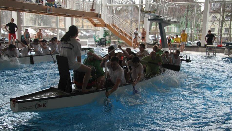 Das Indoor-Drachenbootrennen ist ein Wettkampf, bei dem Kraft, Ausdauer und Schnelligkeit zählt. Die Regeln sind einfach: Beide Drachenboote schippern in der Mitte des Hallenbadbeckens und sind über eine Leine miteinander verbunden. Die Mannschaft, die mehr Kraft durch Rudern aufbringt und ihr eigens Boot Richtung Beckenrand des Nichtschwimmerbeckens bewegen kann, hat gewonnen. Nach ersten Testläufen war klar, das Rennen ist ziemlich haarig und anstrengend. Denn wenn beide Mannschaften gleichzeitig loslegen, geht es jedes Mal nur um wenige Zentimeter.