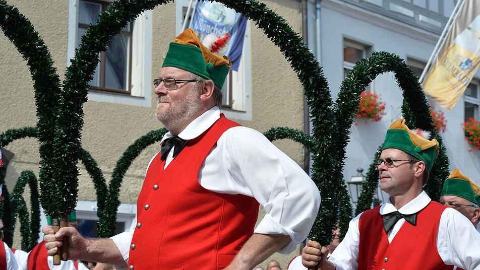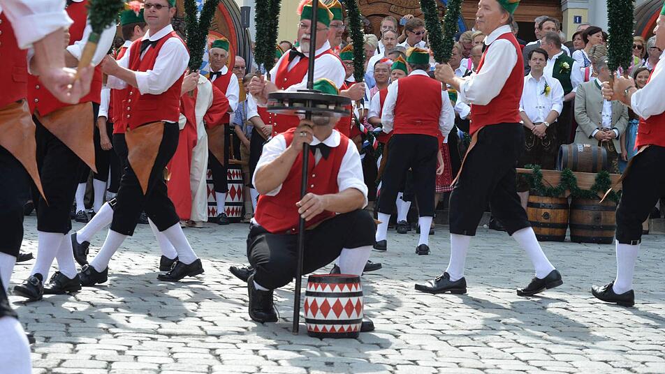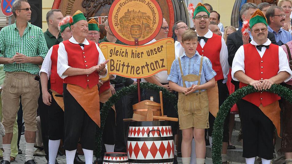 Bevor der Trubel im Stadel startete, zeigten die Büttner vor dem Rathaus ihren traditionellen Tanz. Für die musikalische Umrahmung sorgte die Stadtkapelle Kulmbach, die Böllerschützen ließen es krachen. Für die zahlreichen Besucher boten sich viele Gelegenheiten für einen schönen Schnappschuss.