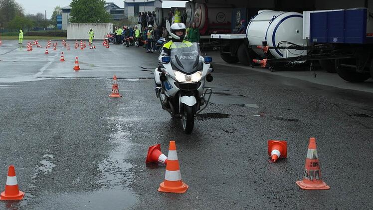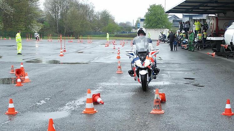 Ein Programmpunkt, der im Vorfeld nicht öffentlich bekannt gemacht worden war, spielte sich auf dem Mönchshof-Gelände in der Blaich ab: Dort testeten die Motorradstreifen der ausländischen Polizei-Delegationen ihr Fahrkönnen auf einen Parcours, den die Kreisverkehrswacht Coburg aufgebaut und betreut hat. Deren stellvertretender Vorsitzender Thorsten Krauß erläuterte: "Die Beamten müssen den Parcours auf Zeit durchfahren, was bei dem nassen Asphalt heute sehr anspruchsvoll ist. Sie merken dabei, dass es halt manchmal nicht so schnell geht, wie man will." Bei der Abendveranstaltung auf der Plassenburg, so Krauß, würden die erfolgreichsten Teilnehmer dann mit Pokalen ausgezeichnet. Seinen Worten zufolge waren Motorradpolizisten unter anderem aus den Niederlanden, Belgien, Österreich, Polen, Slowenien, Ungarn und Kroatien sowie Feldjäger der Bundeswehr am Start.