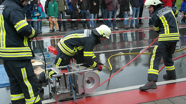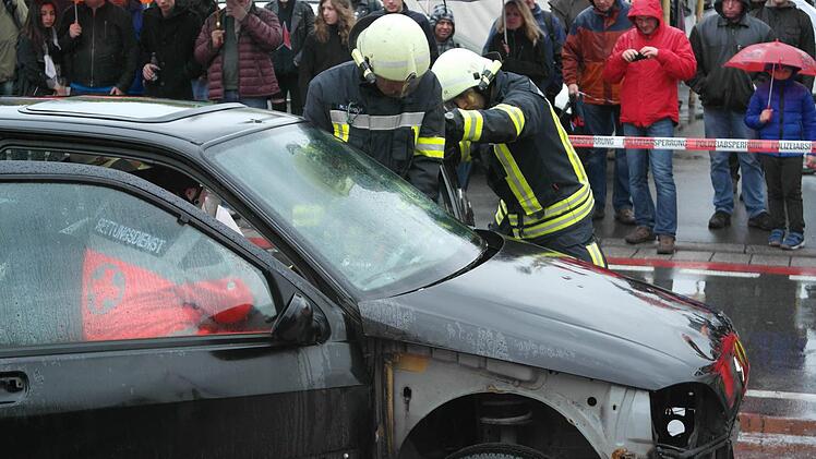 Zwei Stunden später demonstrierte die Kulmbacher Feuerwehr unter der Leitung von Stadtbrandmeister Michael Weich, wie schnell mit der Rettungsschere ein eingeklemmtes Unfallopfer aus einem Auto befreit werden kann: In drei bis vier Minuten ist das Dach weg.