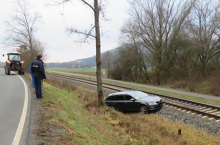 Im Landkreis Kulmbach ist ein Autofahrer von der Fahrbahn abgekommen und eine Böschung hinab auf einer Bahnstrecke gelandet. Die Gleise musste für die Bergung mehrere Stunden gesperrt werden.
