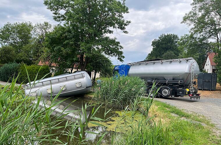 Ein mit Tierfutter beladener Anhänger eines Lastwagens ist am Montag (19. Juni 2023) in einen Teich gekippt: Der Vorfall ereignete sich im Wirsberger Gemeindeteil Osserich.
