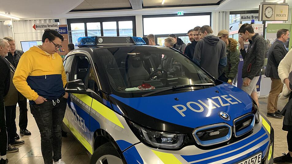 Den nagelneuen Elektro-BMW in die Aula des beruflichen Schulzentrums zu bringen, stellte die Polizei vor ein echte Herausforderung. Die Beamten mussten den Einsatzwagen über eine kleine Treppe befördern. Kurzerhand bauten die Experten der Kfz-Abteilung der Berufsschule eine kleine Rampe und polsterten den Untergrund. Und schon konnte das Auto in die Aula surren.