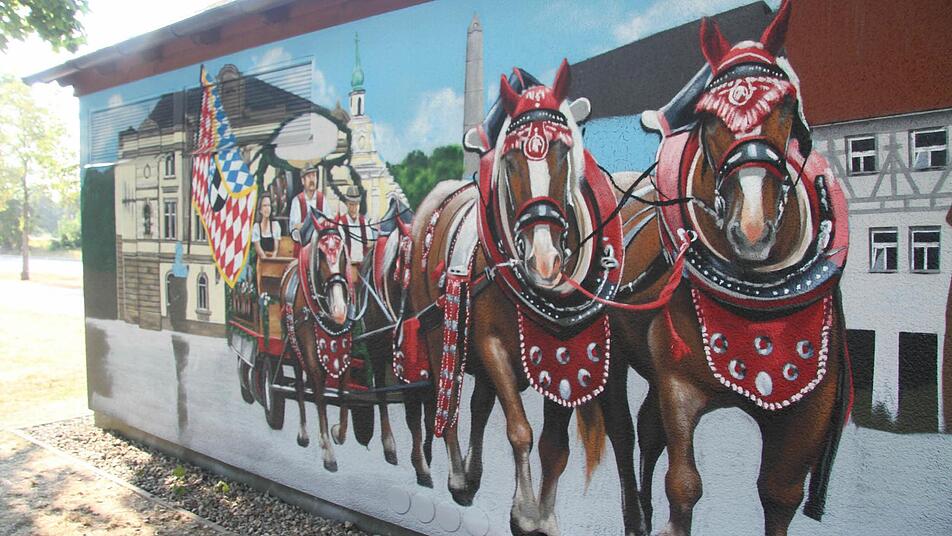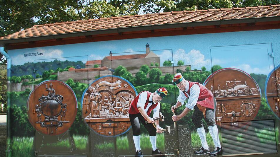 "In Kulmbach wurde ein sehr klassisches Motiv gewählt", sagt Markus Ronge. Es dreht sich ums Bier: Von der Straßenseite aus soll die Plassenburg auf dem Trafohäuschen verewigt werden. Die vier Mega-Bierfässer, die bei der Bierwoche vor dem Rathaus aufgestellt sind, stehen im Vordergrund. Außerdem zeigen Büttner ihren traditionellen Tanz.