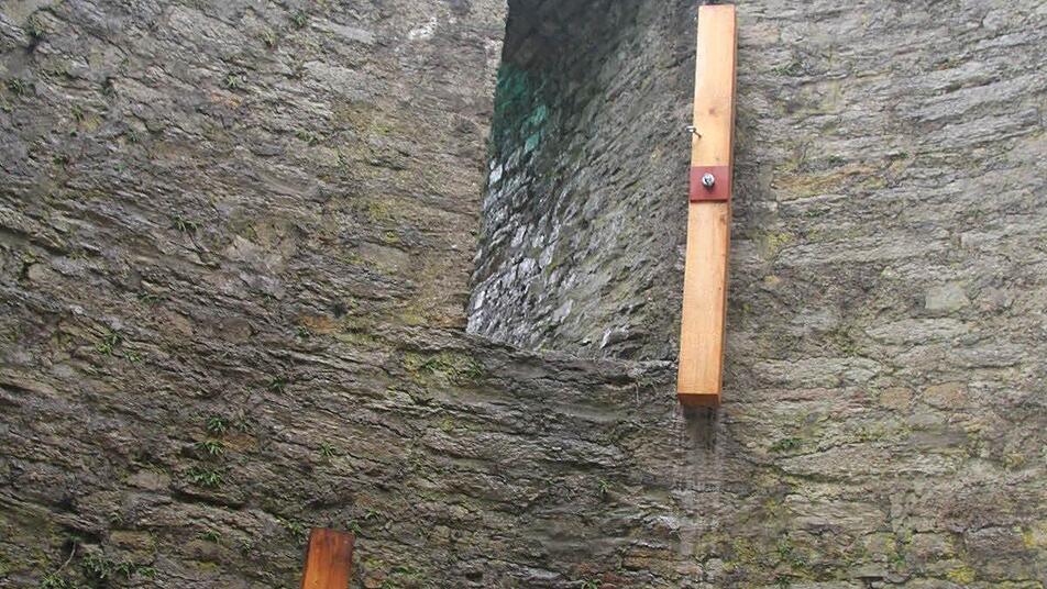 Rund um die Burgruine Nordeck hat die Zimmerei Gräf ein Gerüst aus 18 dicken Holzstützen errichtet. Zusätzlich wird die Holzkonstruktion von dicken Stahlseilen festgezurrt. Von oben schützt eine Plane die Mauern des ehemaligen Wohnturmes. Die Notsicherung ist erledigt.