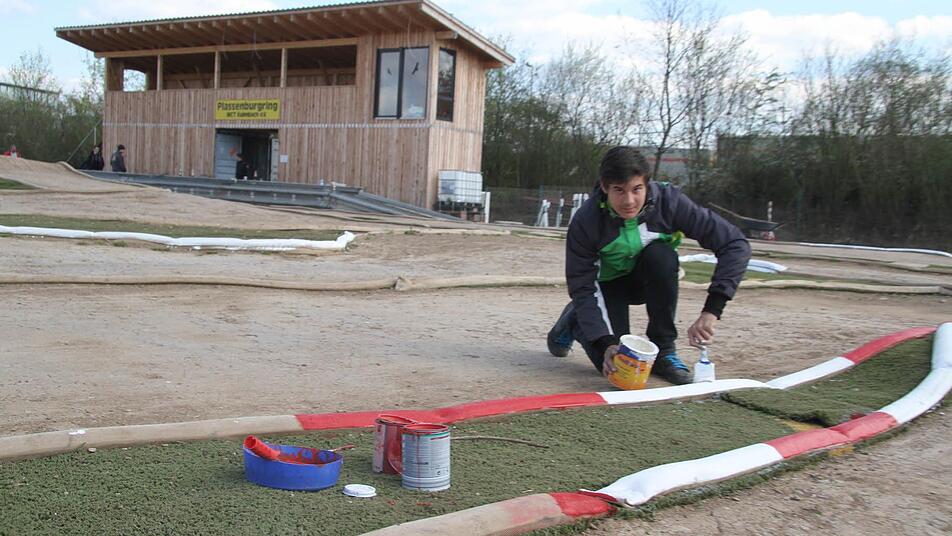 Als Streckenbegrenzung haben die Tüftler des Mini-Cross- Teams Kulmbach alte Feuerwehrschläuche mit Sand gefüllt. Und zwischen den einzelnen Rennbahnen peppt grüner Kunstrasen die Rennstrecke mit Naturboden auf. "Eigentlich würde ich ja viel lieber meine Autos fahren lassen, aber Arbeit muss auch sein", sagt Toni Herzog (15) und schwingt noch wenige Tage vor dem großen Eröffnungsrennen den Pinsel. Toni Herzog hat insgesamt 19 verschiedene RC-Cars und ist ein hoffnungsvolles Nachwuchstalent im Mini-Cross-Team Kulmbach.