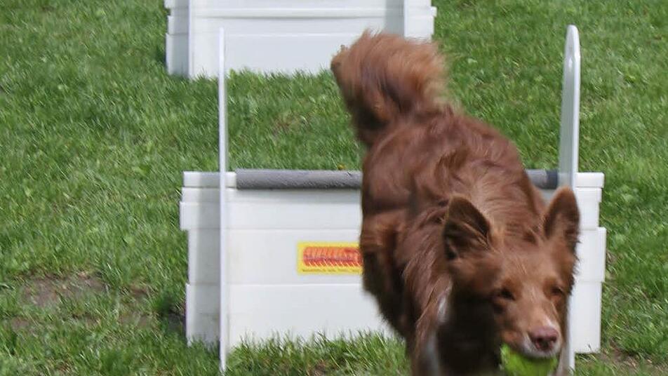 Peggy Maurer steht an der Ballmaschine und spannt einen gelben Tennisball ein. Ein kurzes Kommando, und schon flitzt Border Collie Shiva los. Shiva ist der Hund von Trainer Rafael Lopez und Flyball-Expertin. Wie ein Blitz springt Shiva über die vier Hindernisse direkt auf das Brett der Flyball-Maschine. Der Ball rollt aus der Halterung. Shiva nimmt ihn auf und spurtet zurück - ohne ein Hindernis auszulassen.
