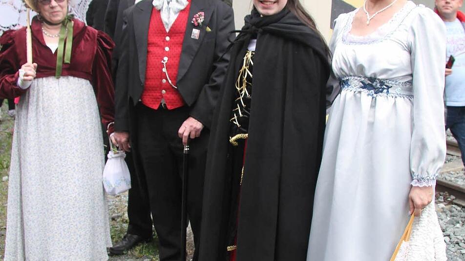 Während die Lok umgekoppelt wird, steigt eine Tanzgruppe in historischen Kostümen aus. Sie begleitet die Dampflok aus Liebhaberei und freut sich über die vielen Fotografen.